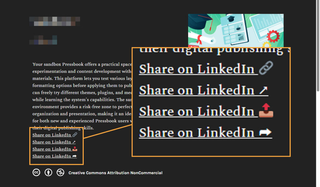 I mentioned that I played with hiding the top of page share buttons using CSS and that if you have multiple (i.e. many Pressbooks networks include Twitter, LinkedIn, and eMail) this approach would remove all three. You may be able to target them by including an additional identifier in square brackets.