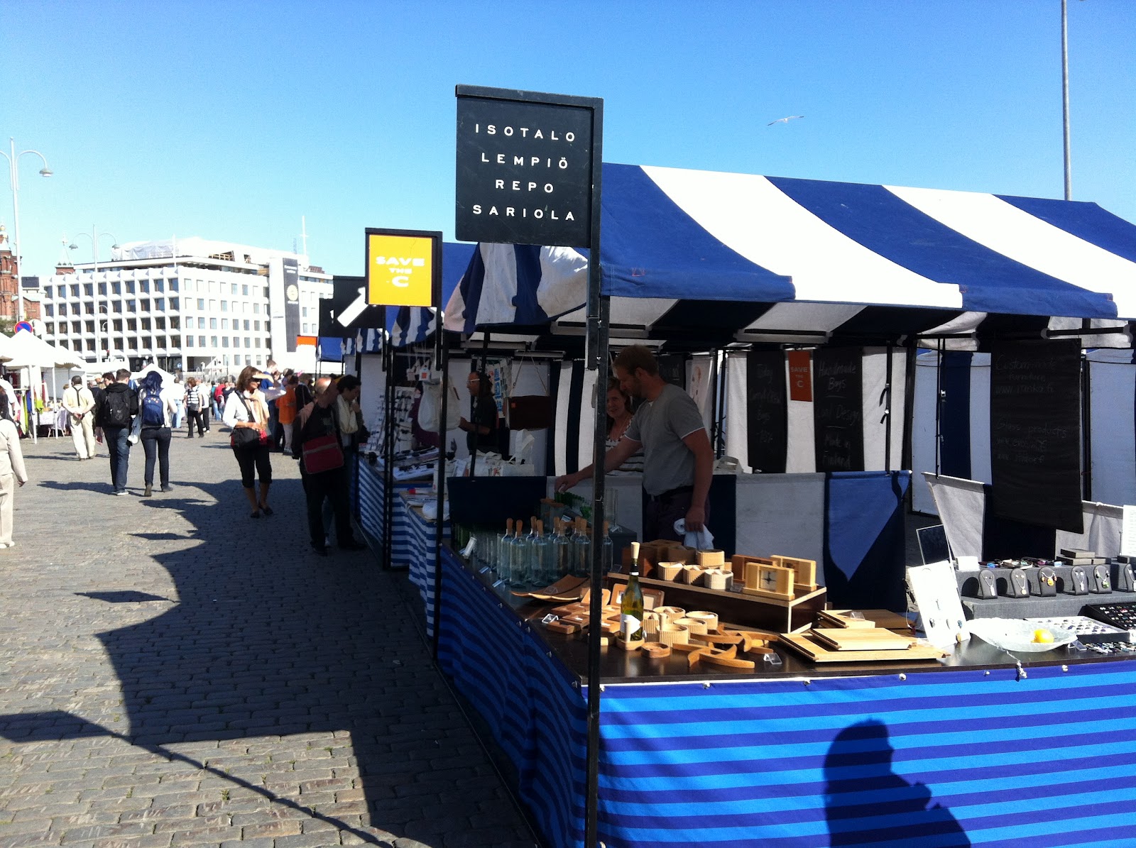 I also went to the market by the harbour to see one of the many WDC2012 pavilions, the Helsinki Design Market. Here local designers can display their works. From glass, to reused rubber, to wood, and cloth the resounding theme of sustainability was present. One of my favourites was old lemonade bottles turned into a glass, a tumbler, and a shot glass.
