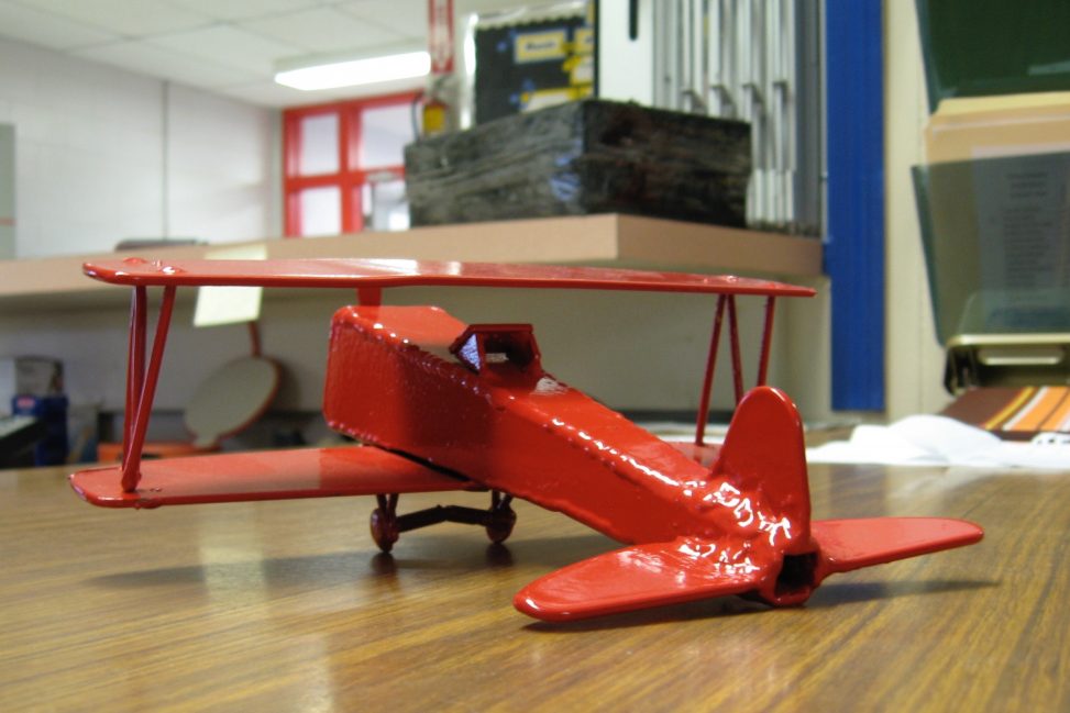 This grade 10 welding project required students to read blueprints, identify the corresponding (precut) parts, and weld the project using oxy-fuel processes. The planes were professionally powder coated by Bourgault Industries.